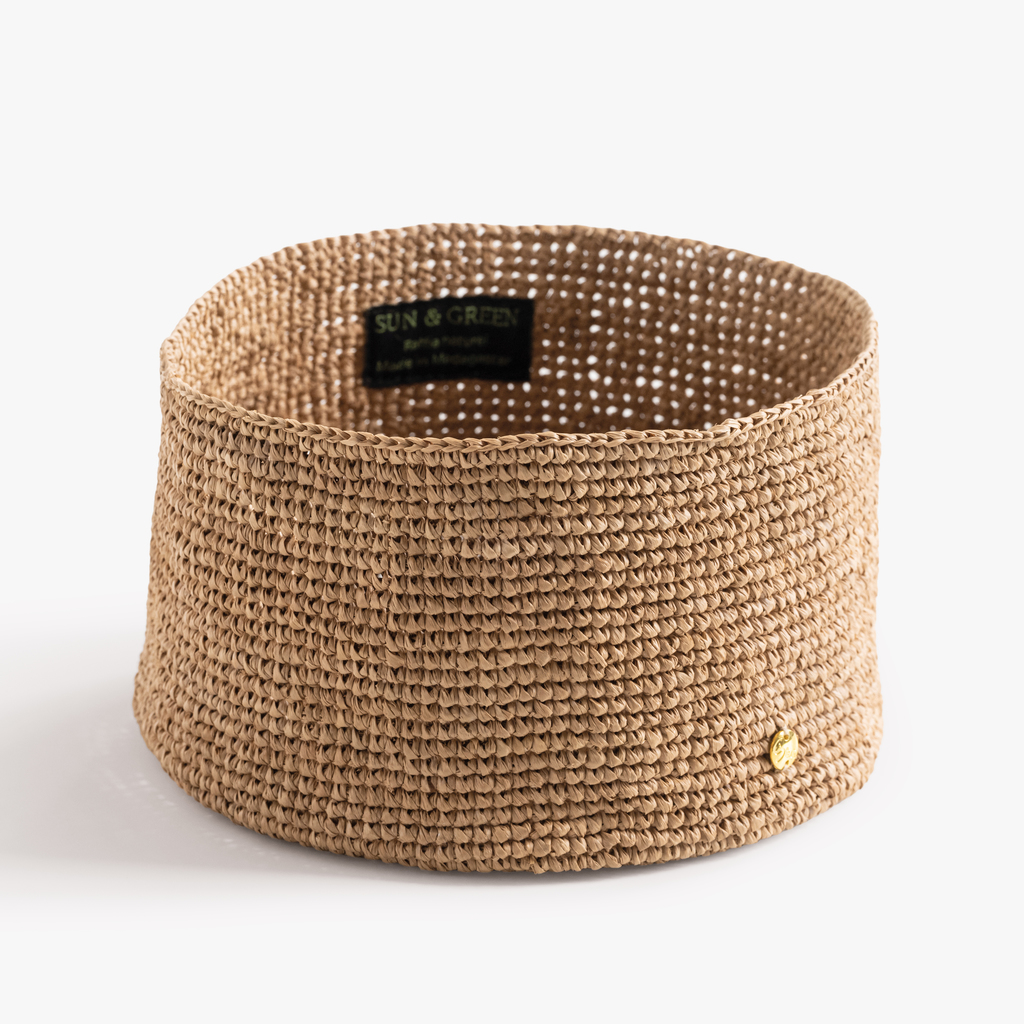 Leichter, vielseitig verwendbarer Aufbewahrungshelfer: Gehäkelt aus Raphia-Garn ist dieser Korb trotz seiner Flexibilität standfest und macht sich nicht nur auf dem sommerlich gedeckten Tisch, sondern auch in Bad, Flur oder Schlafzimmer nützlich. Er wird in Handarbeit auf Madagaskar für ein südfranzösisches Unternehmen mit madegassischen Wurzeln hergestellt.
