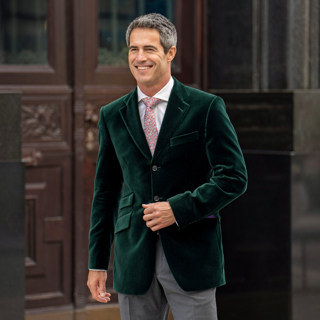 Dieser flaschengrüne Samtblazer verleiht seinem Träger lässige Eleganz und kommt vor allem abends besonders gut zur Geltung – im Vergleich zu Tweed und Loden ist er eine wunderbare, deutlich weniger rustikale Alternative. Der dicke, flauschige Samt entwickelt mit der Zeit dezent hell abgesetzte Falten und leicht abgewetzte Stellen an den Ellenbogen, die den entspannten Charakter des Blazers noch unterstreichen. 3 Knöpfe und 2 Rückenschlitze, schräge Taschen, Billetttasche, dezente Taille. Veilchenfarbenes Futter.