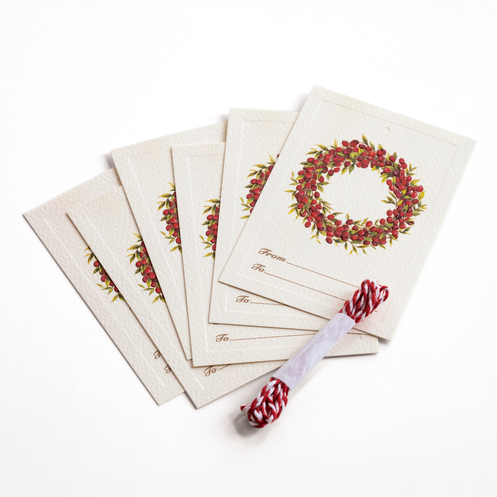 Diese Kärtchen werden mittels eines Bändchens am Geschenk befestigt, sind auf der Vorderseite mit weihnachtlichen Motiven bedruckt und bieten Platz für kurze Weihnachtsgrüße. Sie stammen aus der Papiermanufaktur Rossi bei Florenz und sind aus weißem Karton in Gold- und Prägedruckverfahren hergestellt