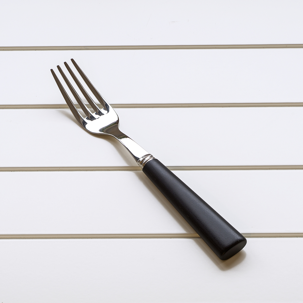 Ein Besteck mit Holzgriffen in klarer, nach unten breiter werdender Form. Das Holz wurde in einem aufwendigen Verfahren durch Kunstharz veredelt und wasserresistent gemacht. Anschließend wurde es ebenholzfarbig gebeizt. Metallteile aus Edelstahl.