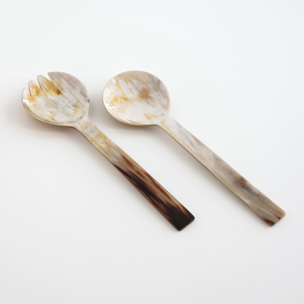 Immer wenn eine große Schüssel Salat auf den Tisch kommt, sollte dieses Salatbesteck mit extrabreiten Löffeln nicht fehlen. Es ist aus echtem Horn gefertigt und besticht durch seine einzigartige Maserung sowie lebendige Farbgebung – von Elfenbeinweiß über warme Brauntöne bis hin zu tiefem Schwarz. Da Horn ein reines Naturprodukt ist, ist jedes Besteck ein Unikat.
