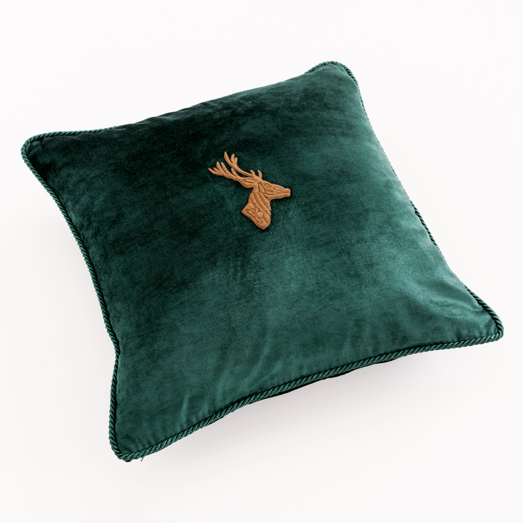 Auf der Vorderseite dieses Samtkissens prangt ein in Zardozistickerei gearbeiteter Hirschkopf, bei dem ein genaues Hinsehen lohnt. „Zari Zardozi“, das „Sticken mit Goldfäden“ ist eine jahrhundertealte indische, sehr aufwendige Sticktechnik mit Metallfäden, Perlen und Draht. Ihren Ursprung hat sie in Persien und war ursprünglich dem Verzieren königlicher Gewänder vorbehalten. Nur wenige Werkstätten in Indien halten die Tradition dieser Handwerkskunst noch aufrecht.