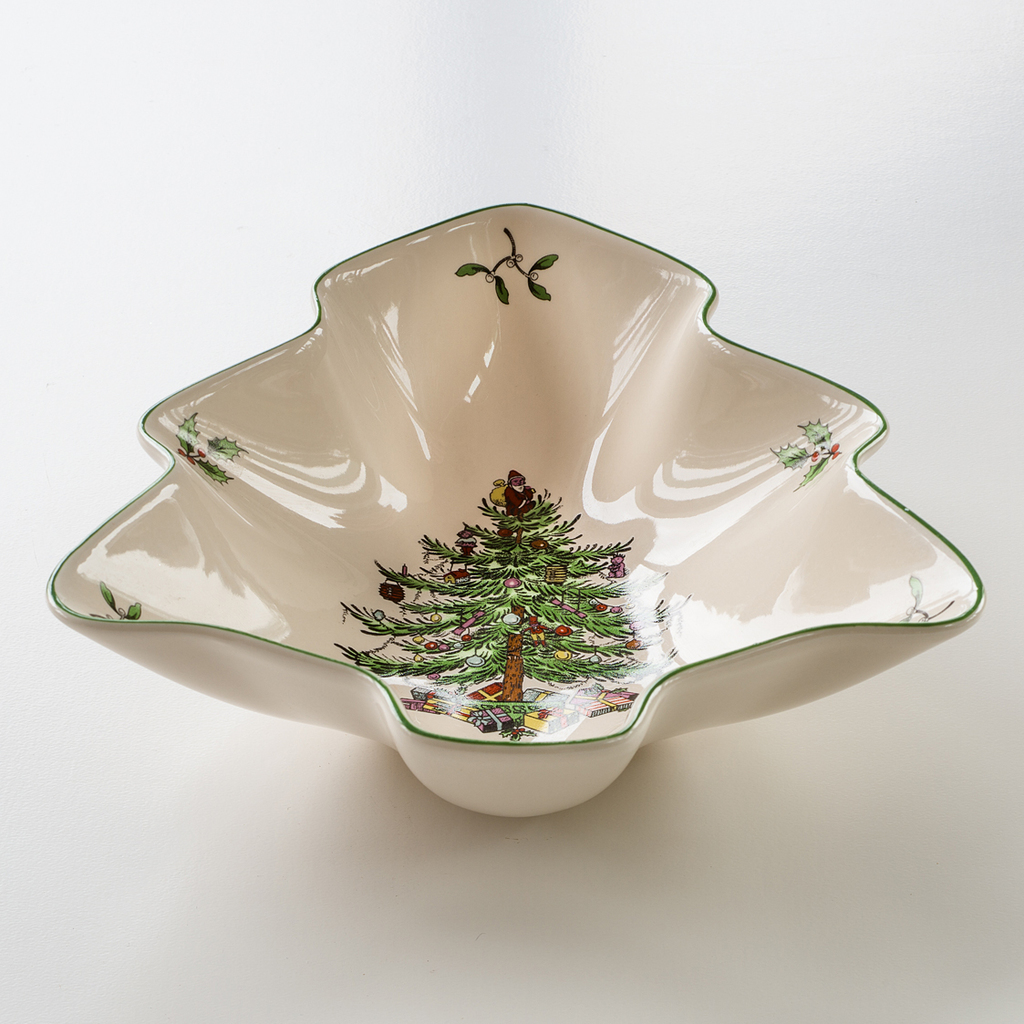 Schale in Baumform aus der Serie Christmas Tree von Spode. Dieses traditionelle, weltbekannte Weihnachtsservice wurde bei Spode bereits 1938 eingeführt und befindet sich heute wieder in unveränderter Form im Programm. Alle Teile zeigen einen reich dekorierten Weihnachtsbaum mit Geschenken darunter und sind gerahmt von einem tannengrünen Rand. Aus Steingut. Das Geschirr ist ofen- und mikrowellenfest.