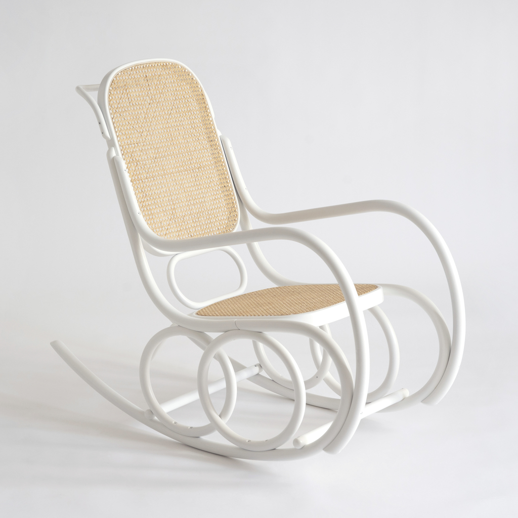 Neben den bekannten Kaffeehausmöbeln wurden ab den 1860er Jahren auch Möbel für den privaten Gebrauch aus Bugholz hergestellt. Als besonders populär erwiesen sich dabei verschiedene Schaukelstuhlmodelle, die für damalige Verhältnisse erstaunlich entspannten Sitzkomfort in unprätentiöser Form und zu sehr erschwinglichen Preisen boten. Hervorzuheben ist bei diesem Schaukelstuhl der Unterbau mit zwei vollständig kreisrunden Bugholzträgern auf jeder Seite: Diese Konstruktion tauchte zur Mitte der 1860er Jahre erstmals auf, konnte sich wegen des höheren Herstellungsaufwands letztlich aber nicht gegen die heute bekanntere Version mit einfacheren, volutenförmigen Trägern durchsetzen. Hergestellt aus dampfgebogenem Buchenholz mit rundem Querschnitt in der ehemaligen Thonet-Fabrik in Bistritz am Hostein im Osten Tschechiens, die seit 1953 unter dem Namen TON firmiert. Bespannt mit Wiener Geflecht. Endmontage mit wenigen Handgriffen.