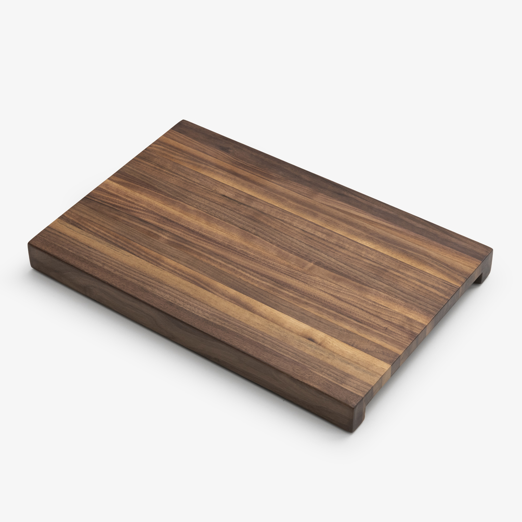 Walnussholz ist ein begehrtes Edelholz, das nur von Bäumen gewonnen wird, die mindestens einmal Nüsse getragen haben. Für Schneidbretter ist es hervorragend geeignet: Es ist sehr zäh, feinfaserig, mittelhart und mittelschwer. Massives, verleimtes und geöltes Walnussholz mit großen, eingefrästen Halbkreisen zum Greifen oder Unterschieben eines Tellers. Kleine Gummifüße gegen Verrutschen.