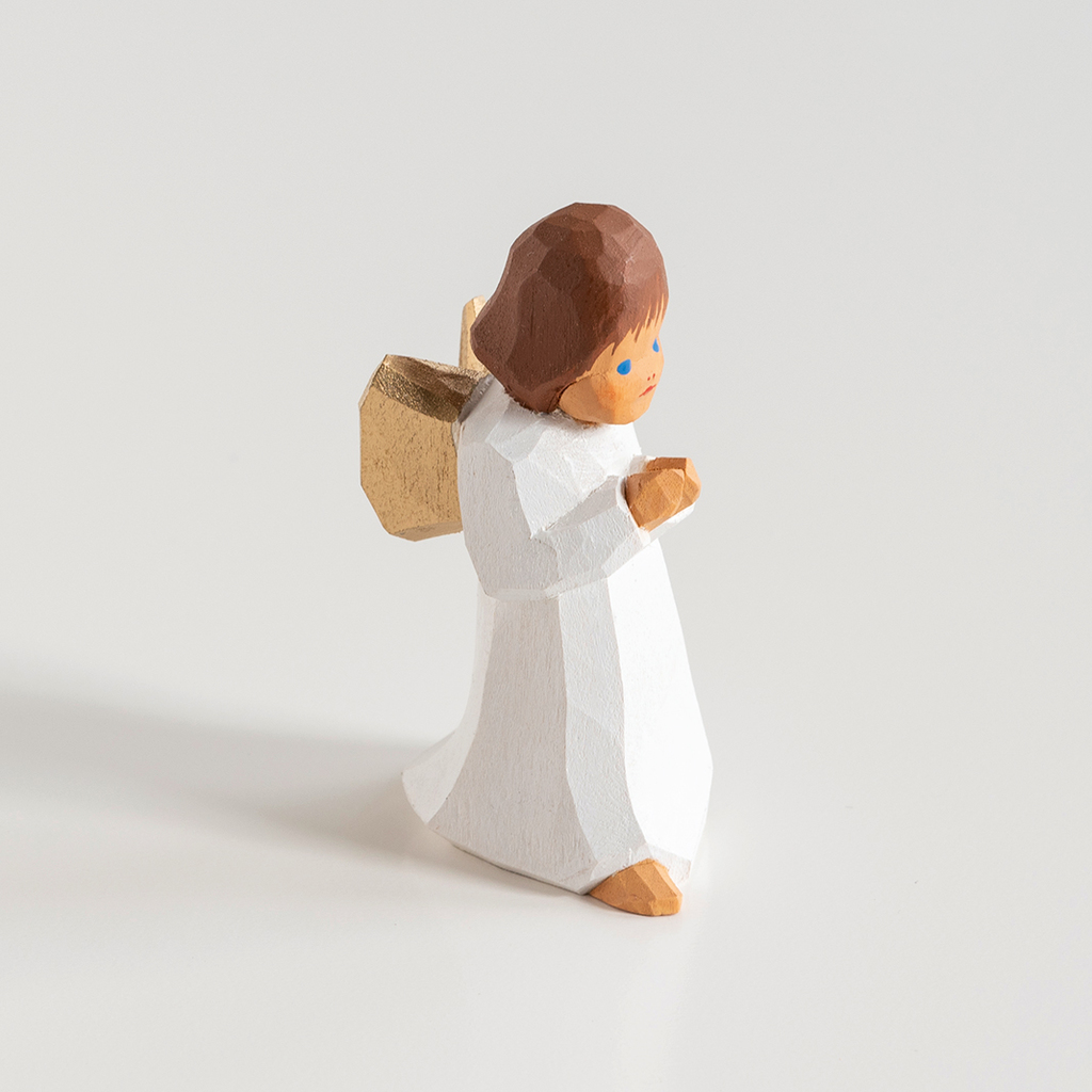 Engel, stehend, mit braunem Haar – von Hand geschnitzt aus Lindenholz.