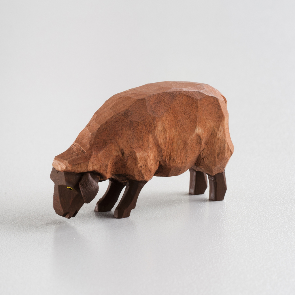 Braunes Schaf, mit grasender Kopfhaltung – von Hand geschnitzt aus Lindenholz.