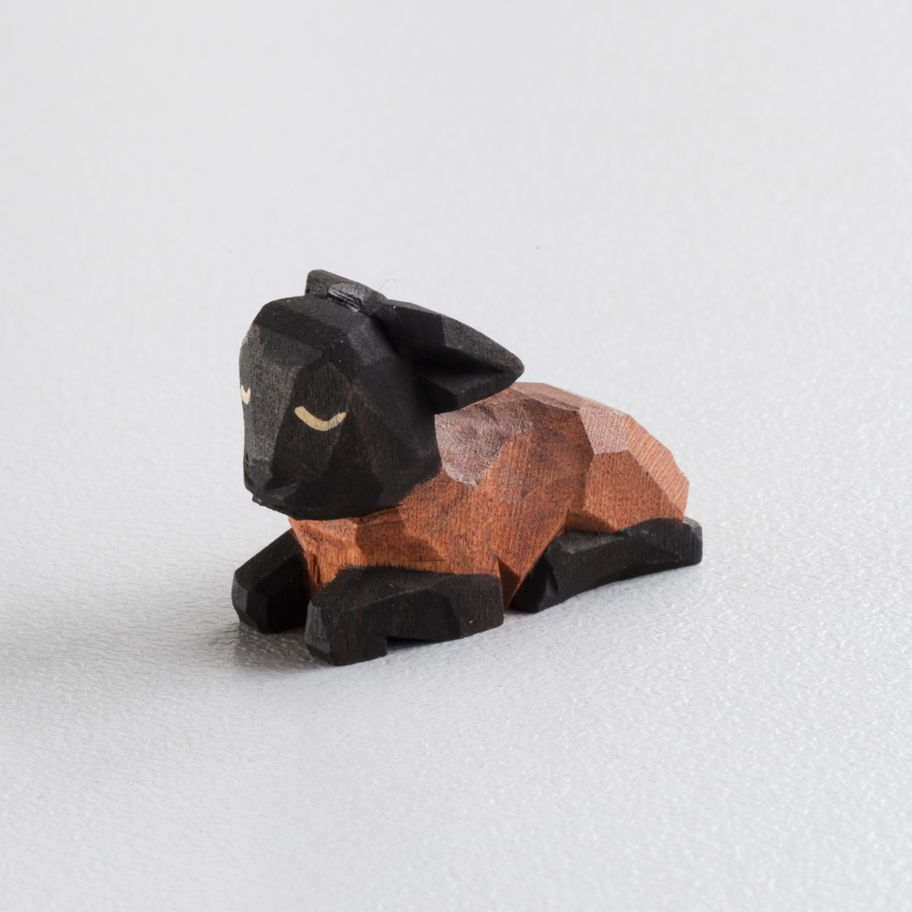Dunkles, liegendes Lamm, nicht nur ein kleines Schaf, sondern wirklich wie ein Lamm aussehend. Von Hand geschnitzt.
