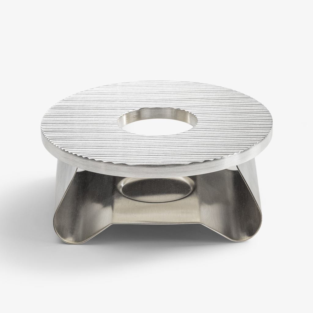 Das bestimmende gestalterische Element ist die runde Heizplatte. Ihre gesamte Oberfläche wird von einer feinen, parallelen Rillenstruktur durchzogen – ein Detail, das von einer besonders sorgfältigen Ausarbeitung zeugt, insbesondere an den sauber definierten Kanten und der zentralen Öffnung. Gefertigt aus Messing und mit einer matt gebürsteten Versilberung veredelt, erhält das Stövchen einen seidigen, zurückhaltenden Glanz.