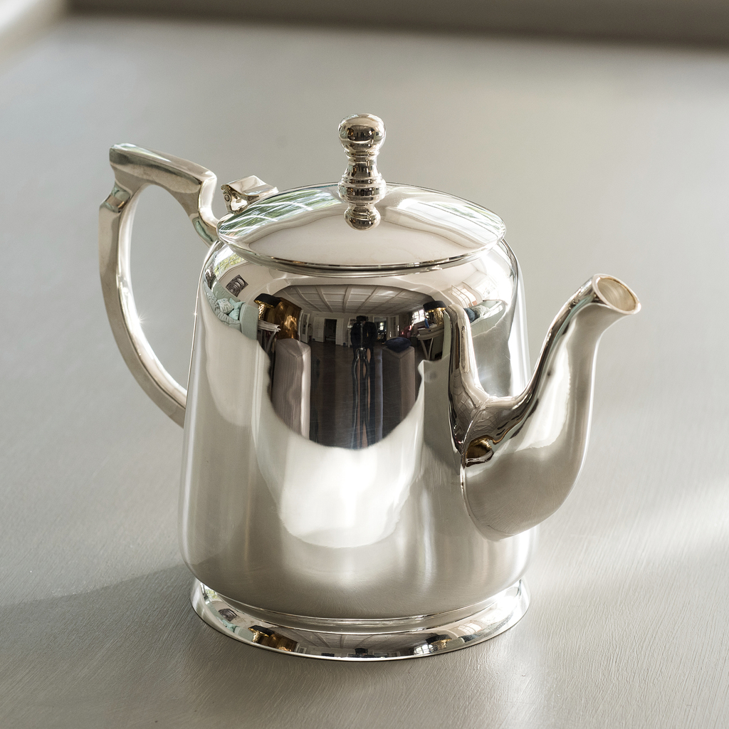 Wenig steht deutlicher für den kolonialen Nachklang des britischen Empire als Tee. Und konsequenterweise gehören dazu selbstverständlich Teeservices wie dieses: Formal lehnt es sich an koloniale Vorbilder aus dem ausgehenden 19. Jahrhundert an – schlicht, mit nur minimal ornamentierten Henkeln und großen, glatten Flächen, die den frostigen Glanz des blanken Silbers gut zur Geltung bringen. Daneben verdankt es seine Existenz einem interessanten Nebenaspekt der britischen Kolonialgeschichte: dem Export von Handwerkstradition und -wissen. Man kann daher behaupten, dass dieses Service durch und durch in der großen Tradition der englischen Silberwarenherstellung des 19. Jahrhunderts steht, obwohl wir es in Indien herstellen lassen. Bewusst ohne Anlaufschutz für echten Silberglanz. Von Zeit zu Zeit sollten die Teile daher poliert werden.