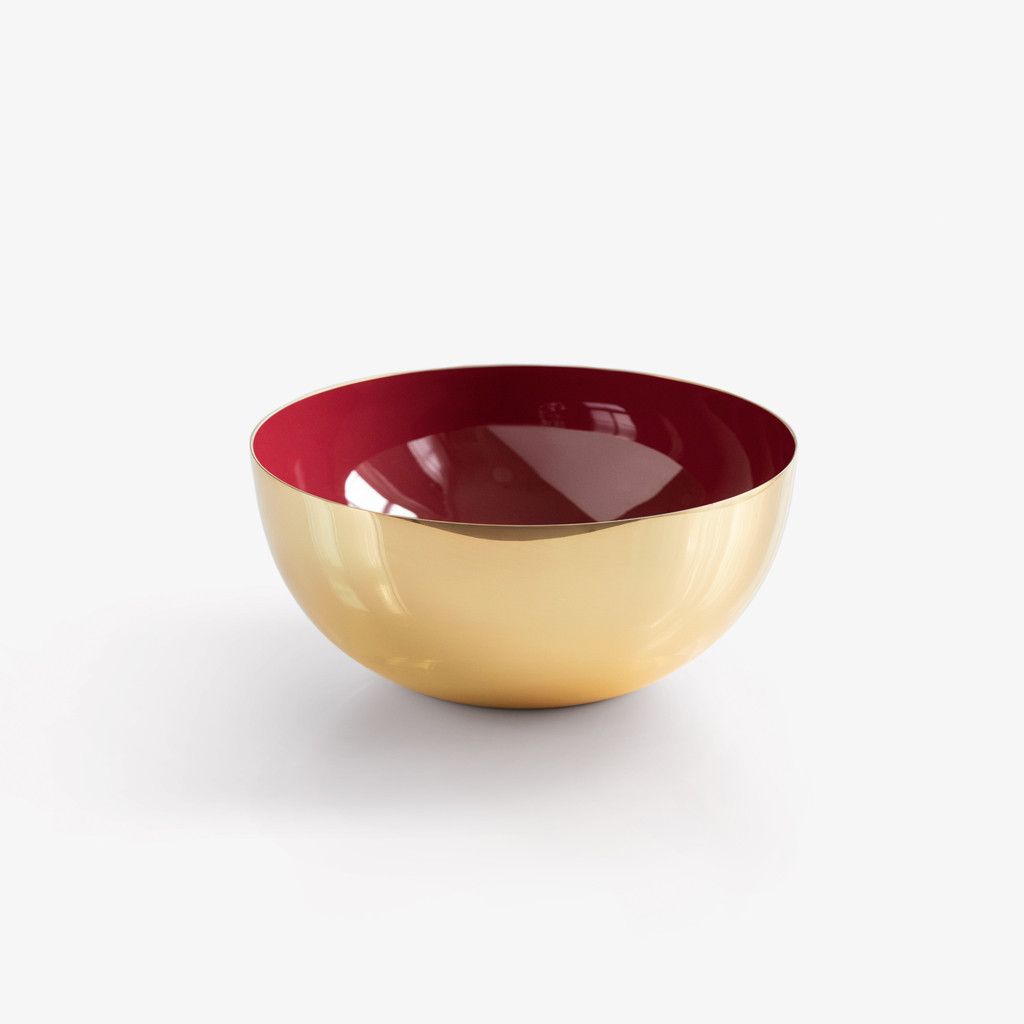 Diese schlichten Schüsseln sind mit und ohne Inhalt sehr vielseitige Dekorationsstücke. Hergestellt aus Messing, lassen wir sie auf der Innenseite mit einer farbigen Schicht aus Kaltemaille versehen: Das Kaltemailleverfahren kommt ansonsten vor allem in der Schmuckherstellung zum Einsatz, wo aufgrund höchst empfindlicher Trägermaterialien nicht mit heißer Glasschmelze gearbeitet werden kann. Stattdessen werden die Farbpigmente hier in hochwertigem Kunstharz gelöst, das auch für die Herstellung teurer Schreibgeräte verwendet wird. Kaltemaille lässt sich zu extrem glatten und brillanten Oberflächen verarbeiten und bietet im Zusammenspiel mit den passenden Farbwerten einen satten, tiefen Farbglanz.