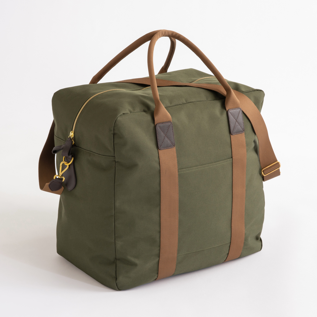 Die perfekte Reisetasche fürs Auto nutzt mit ihrem Format die Höhe im Kofferraum effektiv aus. Stellt man sie aufrecht hinein, bleibt noch jede Menge Platz für andere Reisetaschen, Weinkisten oder weitere Cargo Bags. Hergestellt aus Poly Canvas, einem Verbundmaterial aus einem feuchtigkeitsabweisenden Polyestergewebe außen und einem stabilisierenden Canvas aus 100 % Baumwolle innen. Henkel aus hellbraunem Gurtband, im Griffbereich angenehm rund vernäht. Lederbesätze, alle Metallteile aus massivem Messing. Abnehmbarer, verstellbarer Schultergurt mit Karabinerhaken. Großes Hauptfach, zusätzliches Innenfach mit Reißverschluss.