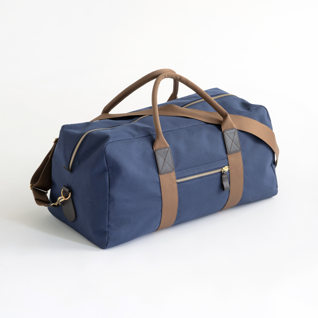 Kompakte Reisetasche mit genügend Platz für ein Wochenende. Großes Hauptfach, separates Innenfach und kleine Außentasche, jeweils mit Reißverschluss. Hergestellt aus Poly Canvas, einem Verbundmaterial aus einem feuchtigkeitsabweisenden Polyestergewebe außen und einem stabilisierenden Canvas aus 100 % Baumwolle innen. Henkel aus hellbraunem Gurtband, im Griffbereich angenehm rund vernäht. Lederbesätze, Metallteile aus massivem Messing. Verstellbarer Schultergurt mit Karabinerhaken.