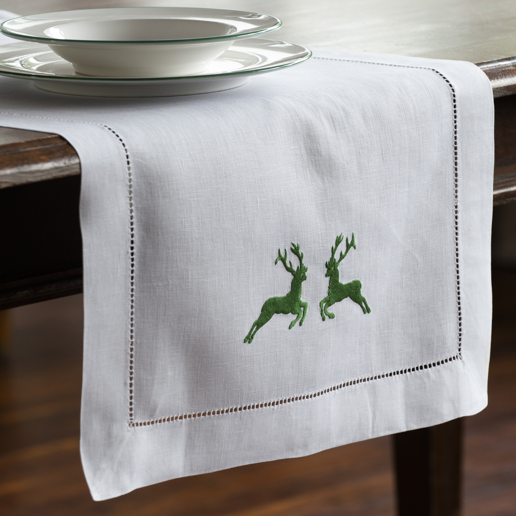 Dieser Tischläufer passt wunderbar zum Geschirr Grüner Hirsch und eigentlich zu allen Anlässen im Herbst, auf dem Land, und wenn Wild serviert wird. Versehen mit einem 3 cm breiten Leiterhohlsaum und von Hand mit farbechtem Seidenfaden bestickt.