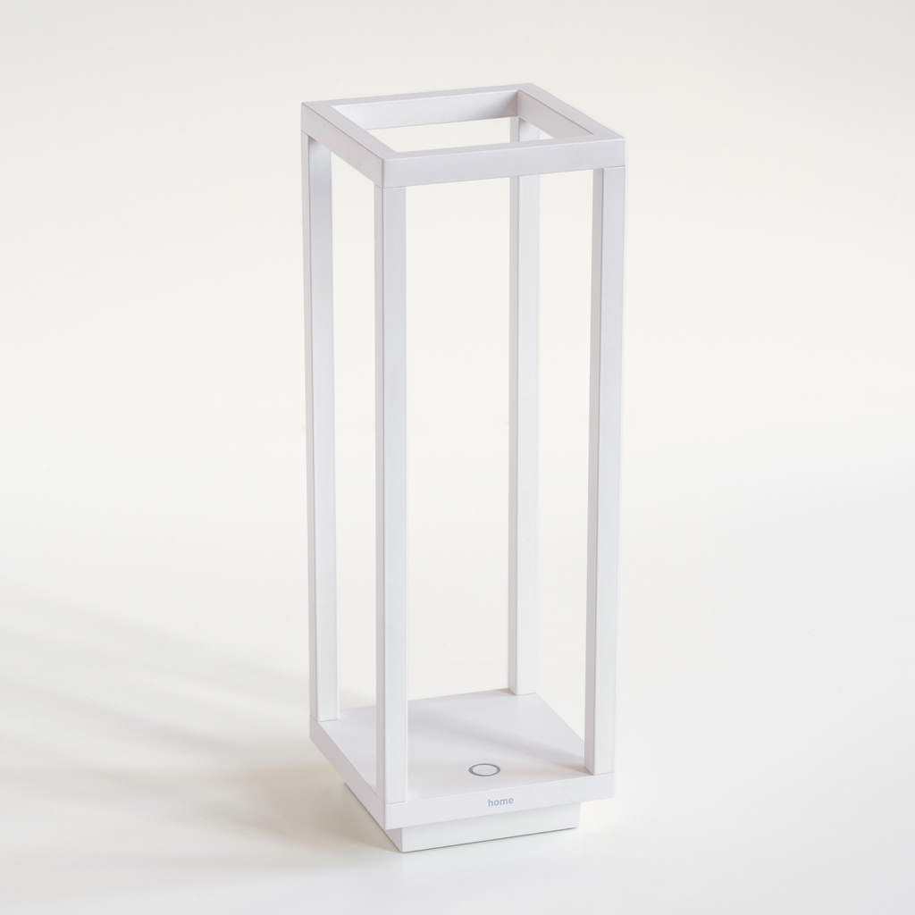 Ihre Form erinnert an eine Laterne, die Funktion dieser tragbaren Leuchte ist aber ganz zeitgemäß auf kabellosen LED-Akku-Betrieb ausgerichtet. Die LEDs sind im oberen Teil des puristischen Aluminiumrahmens platziert und strahlen ein warmes, indirektes Licht nach unten ab, das durch die Berührung der Basis ein- und ausgeschaltet sowie gedimmt werden kann. Sie kann drinnen und draußen als Tisch- oder Bodenleuchte dienen und wie die gute alte Laterne überall mit hingenommen werden, wo etwas Licht gebraucht wird. Bei maximaler Leuchtkraft spendet sie ca. 12 Stunden Licht und braucht 6 bis 8 Stunden zum Wiederaufladen auf der mitgelieferten Kontaktladestation. Hergestellt bei Zafferano im venezianischen Treviso.
