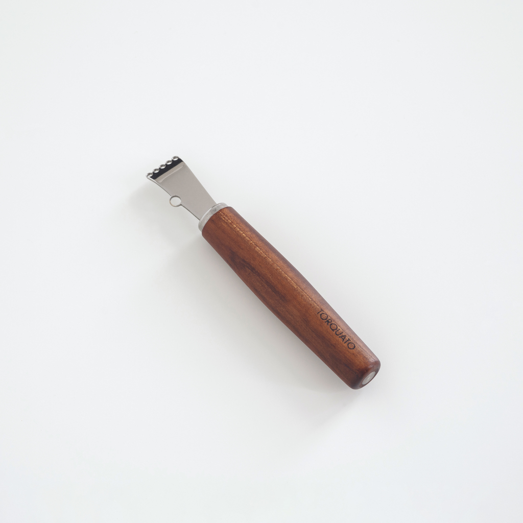 Die Edelstahlklinge mit ihrer geschärften Lochung ermöglicht das mühelose Abziehen feinster Streifen aus der Schale von Zitrusfrüchten. Durch die Schärfe der Lochung reißt man die Schale nicht auf, sondern schneidet sie ab und bewahrt so das volle Zitrusaroma. Je nach Verwendungszweck lassen sich fünf feine Zesten gleichzeitig oder mit der seitlichen Ziselierklinge eine etwas stärkere Spirale, zum Beispiel zum Dekorieren von Cocktails, schneiden.