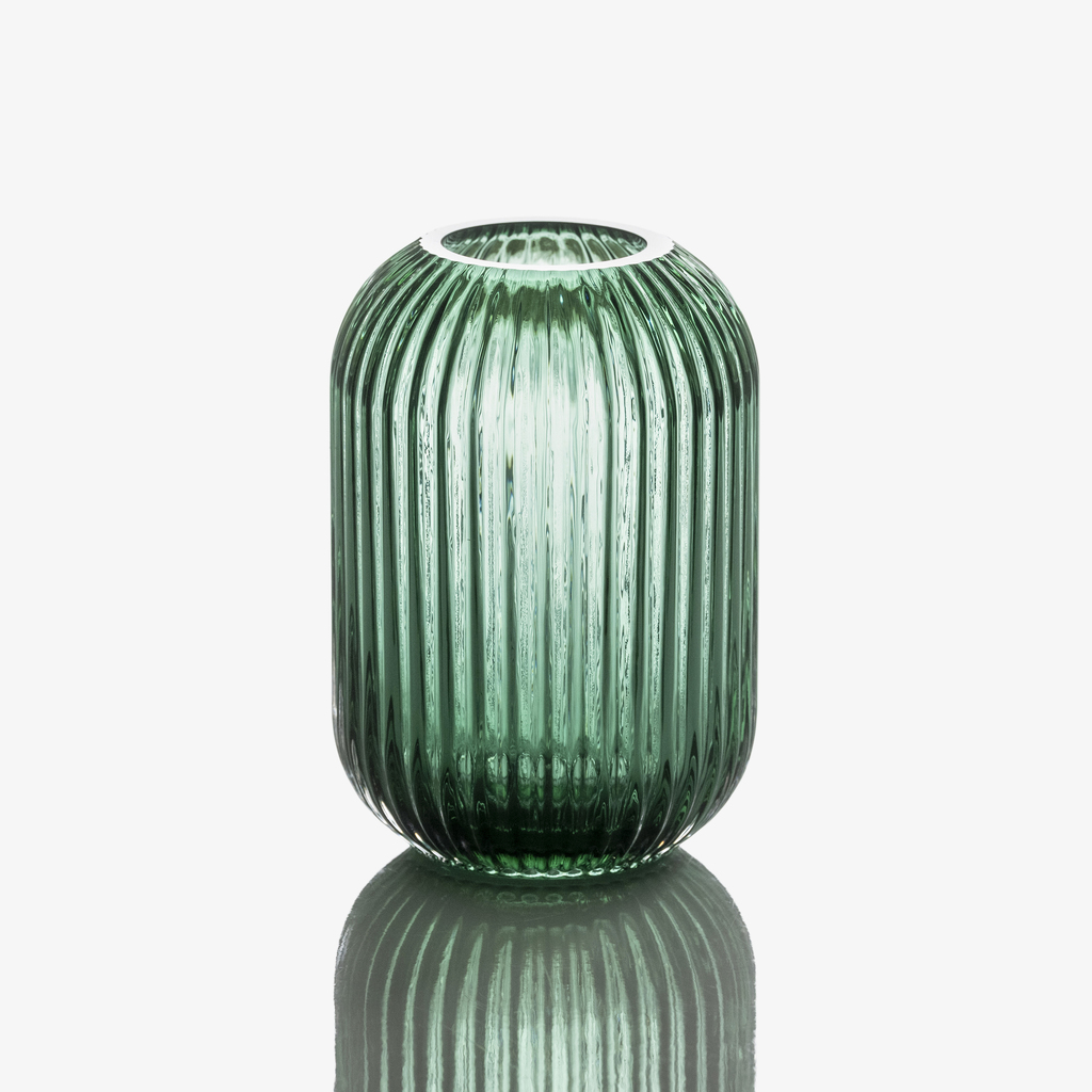 Die Vase nimmt die klassische Lampionform auf und übersetzt sie in Glas. Das Volumen liegt im Mittelteil, wodurch die Silhouette weich und bauchig wirkt, während Fuß und Hals leicht verjüngen. Das vertikale Rillendekor strukturiert die Form und fängt das Licht in feinen Segmenten, was der Oberfläche Tiefe und Bewegung gibt.