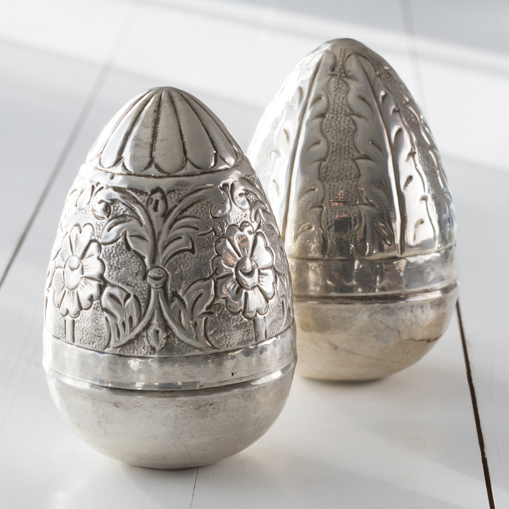 Dekorative Ostereier, von Hand aus Messing getrieben und mit einer Silberauflage versehen. Sie sind nicht nur als österliche Tischdekoration zu gebrauchen, sondern auch zum Verstecken kleiner Ostergeschenke. Die Eier an sich sowie das auf den Oberteilen sichtbare Dekor entstehen in Handarbeit, jedes einzelne ist ein Unikat.