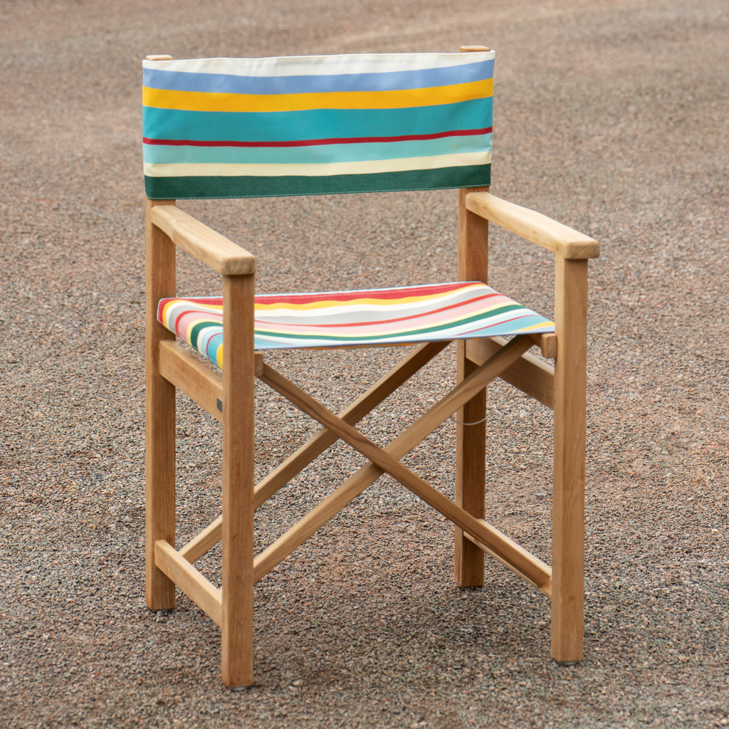 Klassischer, flach zusammenklappbarer Regiestuhl von den Weishäupl Werkstätten im Chiemgau. Hergestellt aus massivem, unbehandeltem Teakholz bester Qualität aus lizensiertem Anbau mit FLEGT Genehmigung.