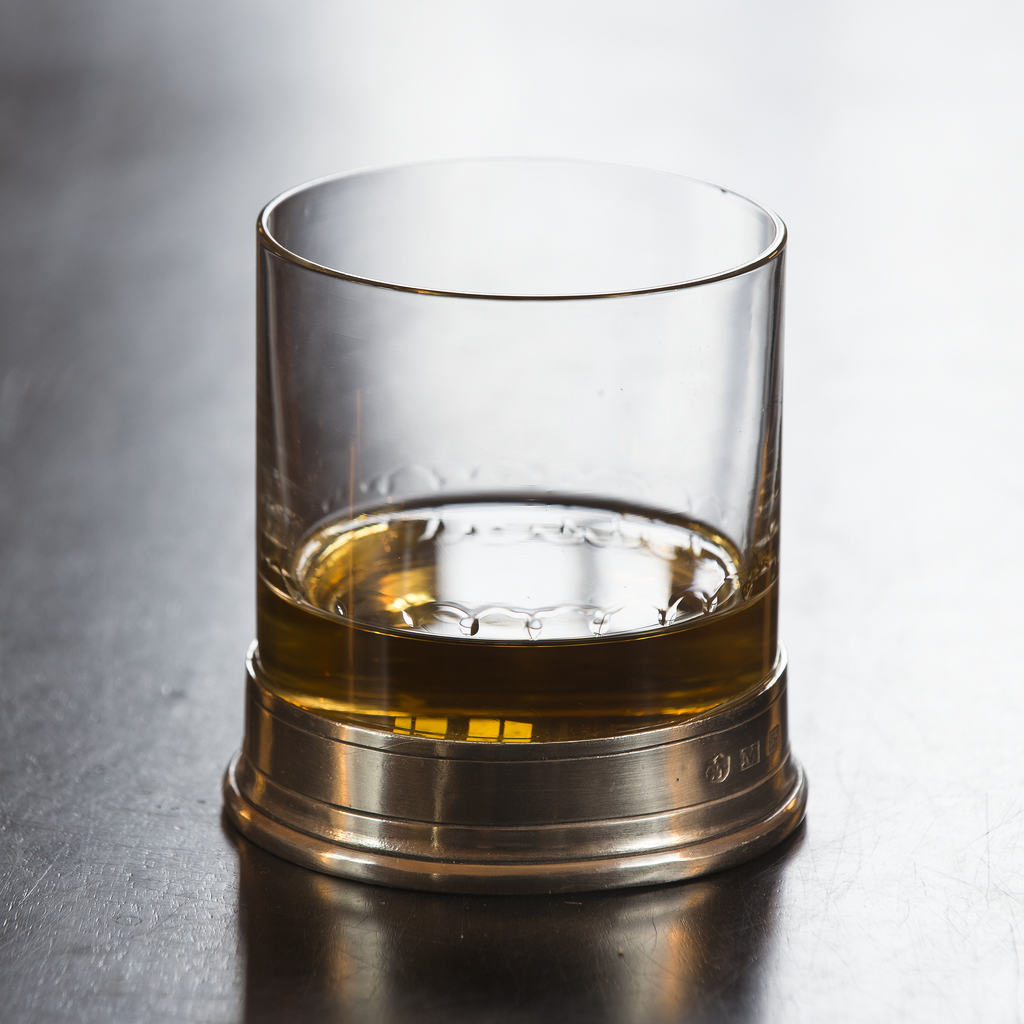 Der Fuß aus poliertem Zinn macht den Tumbler noch schwerer – und zu einem tollen Eyecatcher. Der Tumbler stammt aus Italien.