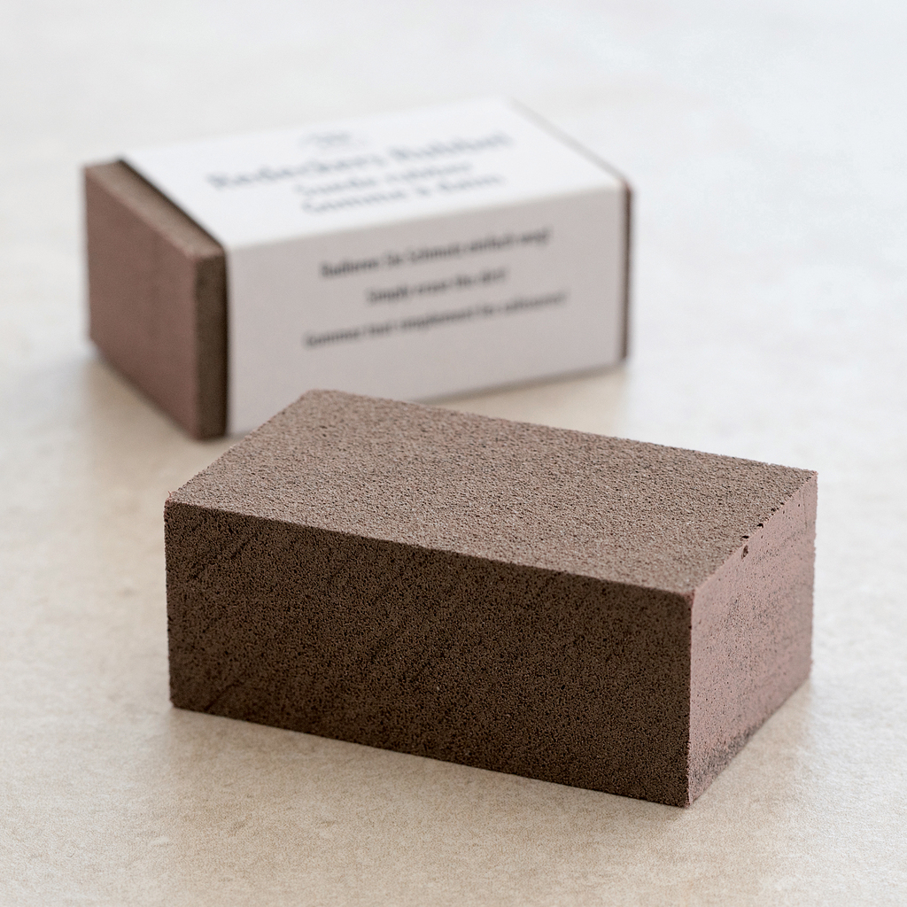Da Wildleder nicht wie Glattleder mit Schuhcreme oder Politur gereinigt werden können, müssen oberflächliche Verschmutzungen auf andere Art entfernt werden. Dieser Wildlederrubbel funktioniert dabei wie ein Radiergummi: Er wird auf der verschmutzten Stelle hin und her bewegt. Dabei bildet sich Abrieb, der die Verschmutzung mitnimmt.