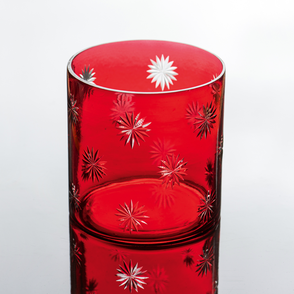 Ein von Hand eingeschliffenes Sternendekor bringt dieses Windlicht aus rubinrot lackiertem Glas zum weihnachtlichen Glitzern. Beim Einschleifen des Dekors wird die Farbschicht durchtrennt, sodass die darunterliegende, klare Schicht zum Vorschein kommt.