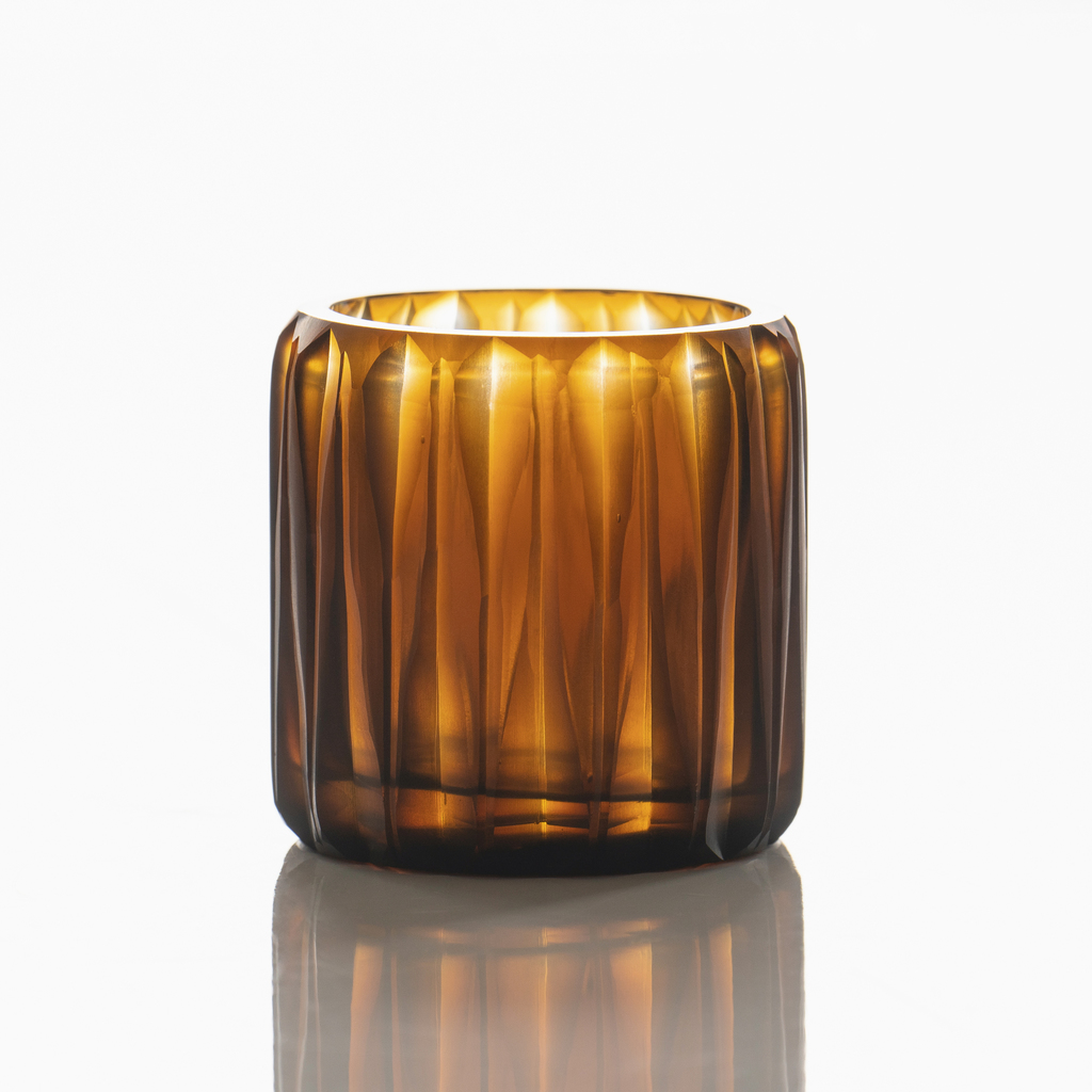 Ein warmes honigfarbenes Licht verbreitet sich aus diesen mundgeblasenen Windlichtern, deren linsenförmig eingeschliffene Rillen für ein lebendiges Spiel der Kerzenflamme sorgen. Der markante Glasschliff ist reine Handarbeit. Dadurch fallen die Rillen in ihrer Tiefe und Breite immer leicht unterschiedlich aus, so dass jedes Windlicht ein individuelles, organisches Dekor aus hellem und dunklem Glas erhält.