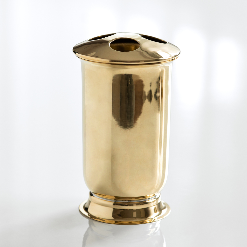 Badaccessoires aus poliertem, massivem Messing, die in ihrer Formensprache des ausgehenden 19. Jahrhunderts in Frankreich erinnern: ein schlichter, zylindrischer Becher mit leicht ausladendem Rand auf einem kleinen Sockelfuß. Das Messing ist bewusst nicht mit einem Anlaufschutz ausgestattet, sodass sich mit der Zeit eine schöne Patina entwickelt. Um den Glanz der Oberfläche zu erhalten, ist gelegentliches Polieren mit Messingpolitur notwendig.