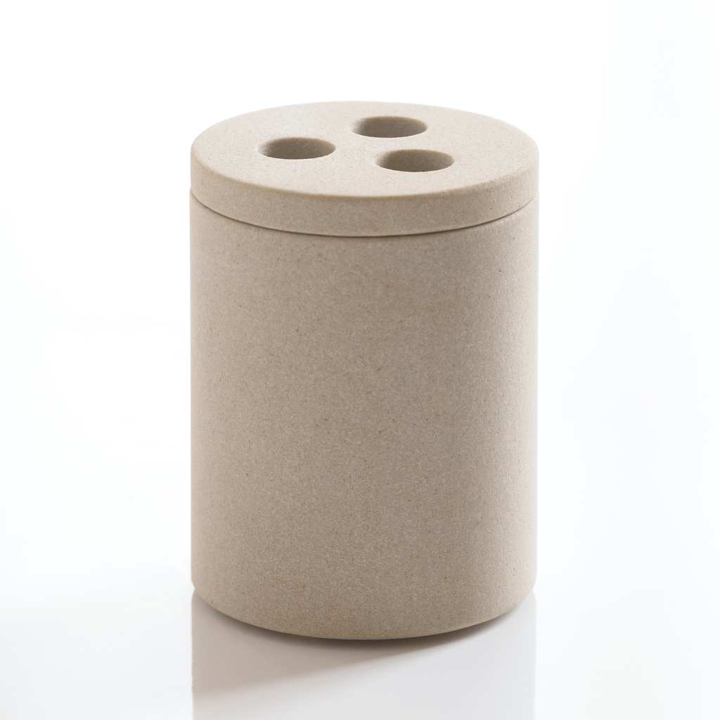 Jedes Stück dieser puristischen Badezimmerserie lassen wir aus massivem Sandstein fräsen, aus dem normalerweise Fliesen oder Fassadenelemente gefertigt werden. Der besondere Charme des Materials liegt in seiner leicht rauen, offenporigen Oberfläche, die sich angenehm anfasst und im Laufe der Zeit durch den Kontakt mit Wasser und Seife eine leichte Patina erhält. Da Sandstein ein Naturprodukt ist, kann jedes Stück in Färbung und Textur minimal von den anderen abweichen. Kunststofffüßchen am Boden sorgen dafür, dass empfindliche Keramik- oder Glasoberflächen im Bad nicht zerkratzt werden.