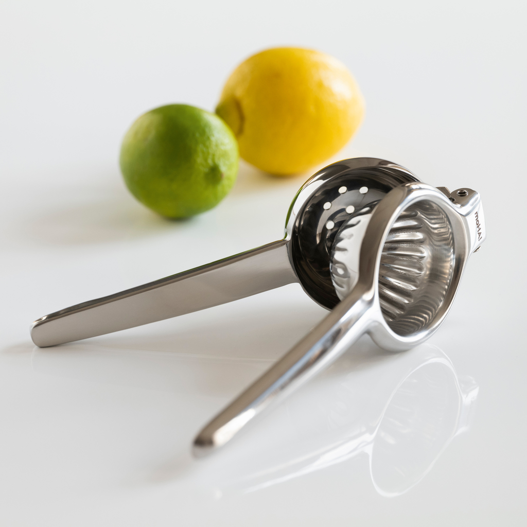 Eine Zitronenpresse aus dem professionellen Barbereich. Durch die Hebelwirkung der langen Griffe lassen sich Zitrusfrüchte besonders behutsam und gut dosierbar auspressen – ideal, wenn es darauf ankommt, nur wenige Tropfen zuverlässig zu dosieren. Schwere und solide Ausführung, vollständig aus poliertem Edelstahl.